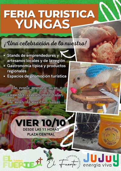 Veni a la feria turística de las yungas, un evento pensado para compartir conocer y disfrutar lo mejor de nuestras raíces, habrá música, danza, sabores regionales, stands de emprendedores de El Fuerte y localidades vecinas
