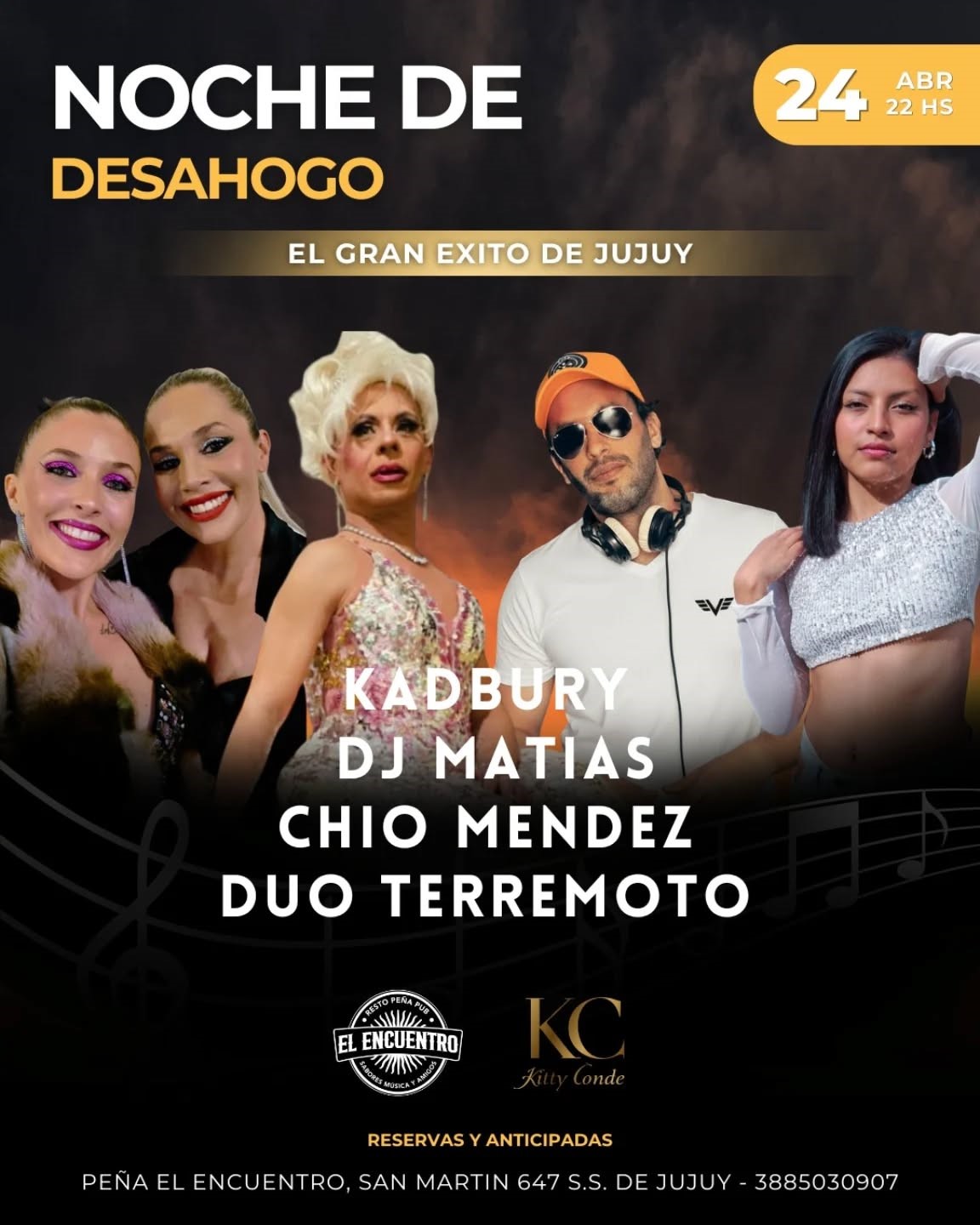 ¡Llega la fiesta que es un éxito total en Jujuy! Una noche vibrante para disfrutar con amigos y bailar sin parar. El escenario de El Encuentro recibe un line-up variado y lleno de energía: el show de Kadbury, las mezclas de DJ Matías, y las presentaciones de Chio Méndez y Dúo Terremoto. Una propuesta moderna y festiva que combina música en vivo y el mejor ambiente de la capital.