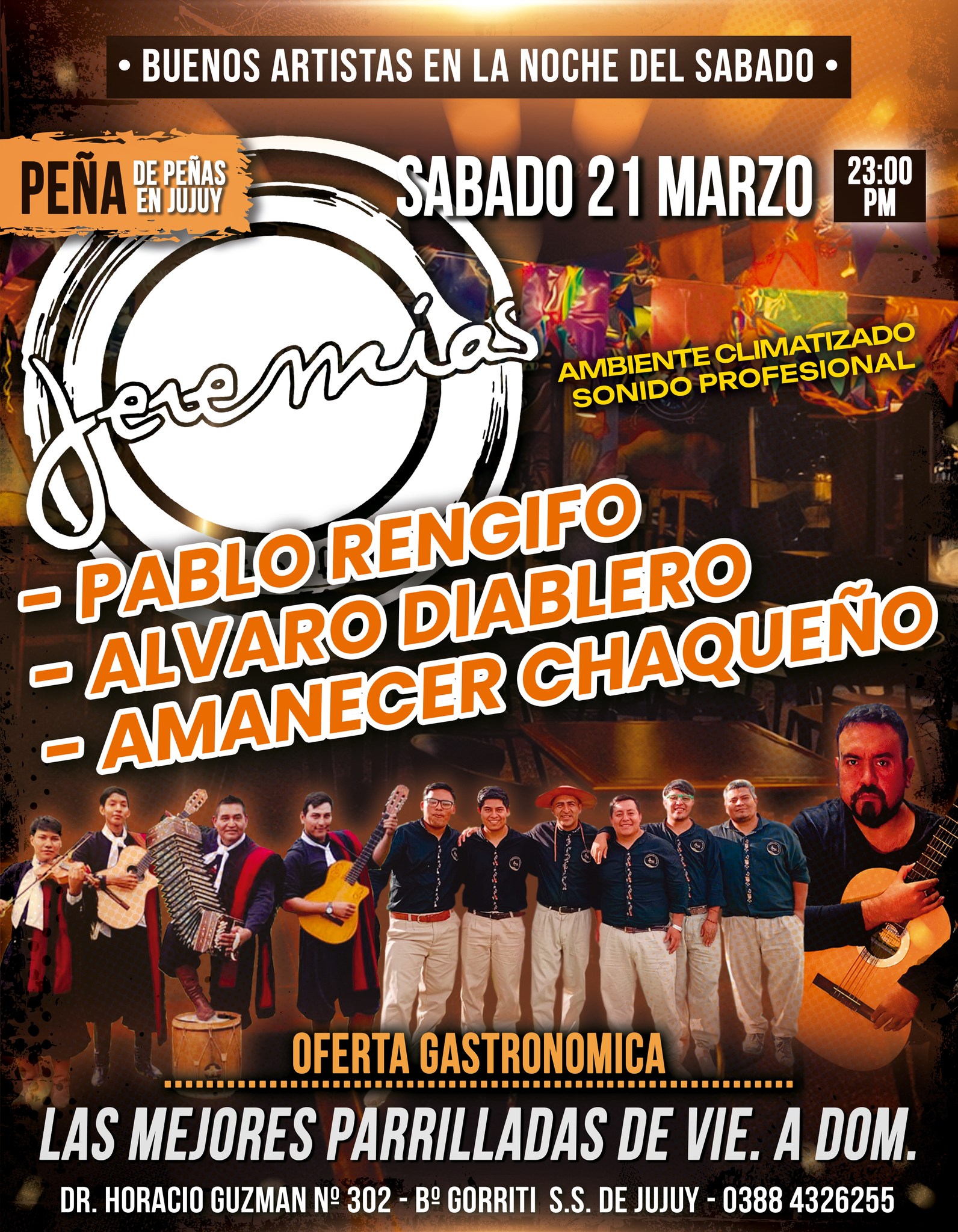 Jeremías Peña presenta show en vivo de los grupos más destacados del momento, este sábado con la actuación de Pablo Rengifo – Alvaro Diablero – Amanecer Chaqueño.
