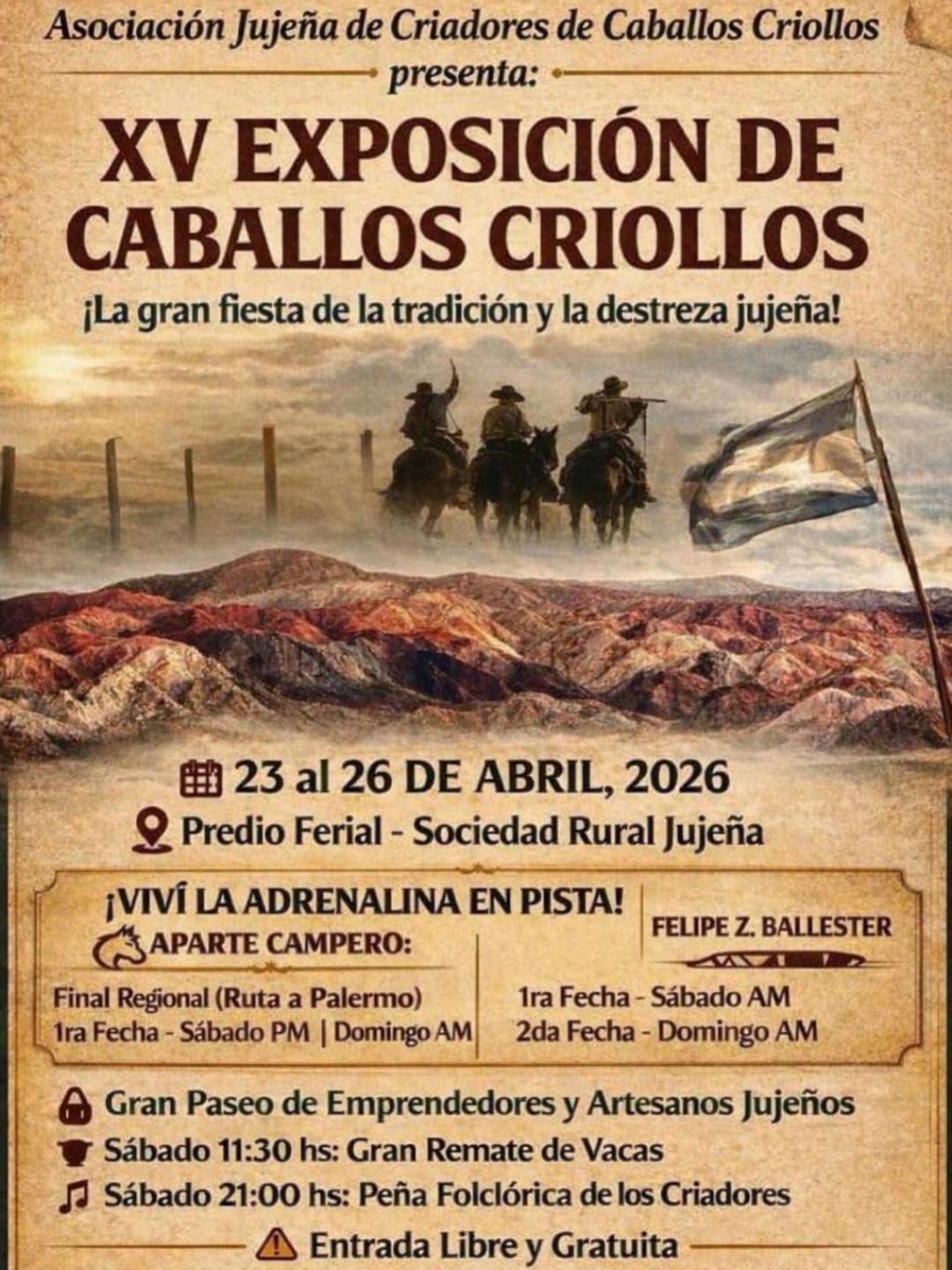Llega la XV Exposición de Caballos Criollos, el evento que reúne lo mejor de nuestra identidad en la pista. Preparate para vivir cuatro días a pura adrenalina y orgullo jujeño.